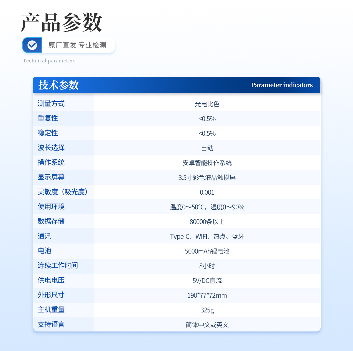 产品描述:仪器特点:1.采用全新安卓系统,配置7英寸液晶触摸屏显示,人性化中文操作界面,读数直观、简单。2.仪器主控芯片为ARM Cortex-A7,RK3288/4核处理器,主频1.88Ghz,运转速度更快速,稳定性更强显示方式:3.检测采用全密封滴定池瓶,避免试剂与人接触,杜绝环境湿度对检测的影响;检测过程中仪器自动控制,搅拌、测定60秒左右【详情】