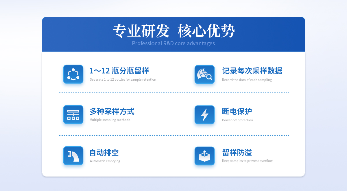 | 1、分瓶留样功能:仪器可实现 1~12 瓶分瓶留样,瓶数可自由设定; | 2、采样功能:可实现定时采样、时间等比、流量等比、外控采样、串口控制等多种采样方式; | 3、记录功能:可记录每次采样的留样瓶号、留样时间、留样量、COD 值和 NH3-N 值,可记录最新 1000 条数据记录; | 4、对外接口:流量计模拟接口,RS485 接口; | 5、断电保护功能:仪器在运行状态下断电并重新通电后,仪器能自动恢复原 运行状态,断电后仪器参数不丢失; | 6、自动排空功能:每次采样完毕,系统可自动排空管内存水,以保证采样管 路不产生沉积堵塞; | 7、防溢功能:用户可设置留样瓶数量,完成设定瓶数的留样后停止留样; | 8、水样冷藏功能:采用高效制冷装置,可使留存的水样保存在 0℃~4℃环境; |