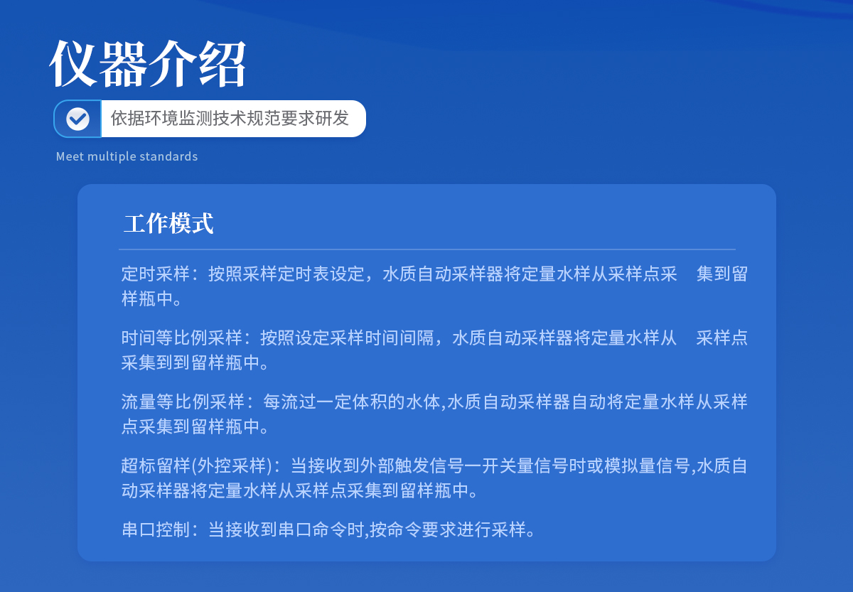 | 1.定时采样:按照采样定时表设定,水质自动采样器将定量水样从采样点采 集到留样瓶中。 | 2.时间等比例采样:按照设定采样时间间隔,水质自动采样器将定量水样从 采样点采集到到留样瓶中。 | 3.流量等比例采样:每流过一定体积的水体,水质自动采样器自动将定量水样从采样点采集到留样瓶中。 | 4.超标留样(外控采样):当接收到外部触发信号一开关量信号时或模拟量信号,水质自动采样器将定量水样从采样点采集到留样瓶中。 | 5.串口控制:当接收到串口命令时,按命令要求进行采样。 |