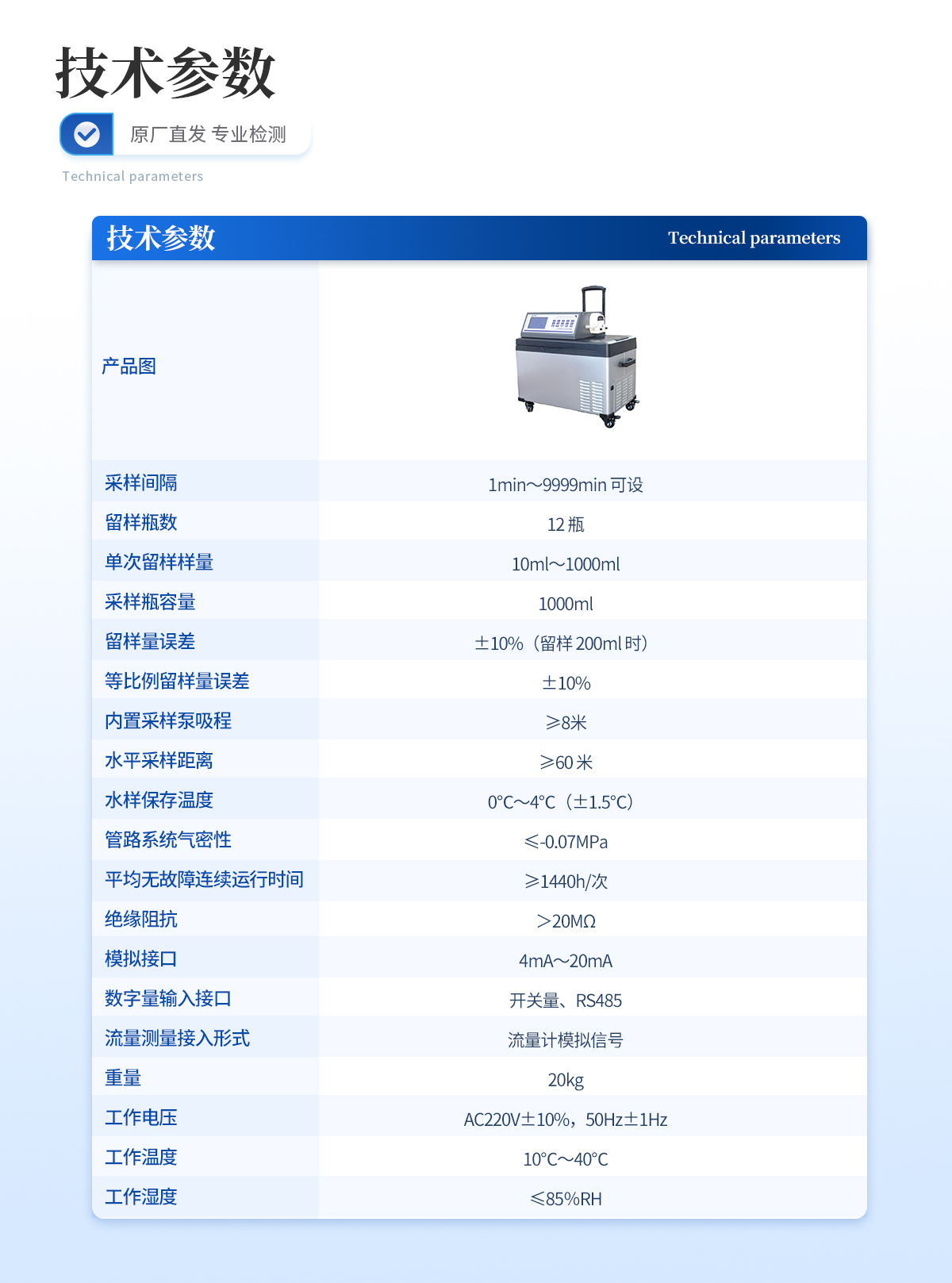 | 采样间隔:1min~9999min 可设 | 留样瓶数:12 瓶 | 单次留样样量:10ml~1000ml | 采样瓶容量:1000ml | 留样量误差:±10%(留样 200ml 时) | 等比例留样量误差:±10% | 内置采样泵吸程:≥8米 | 水平采样距离:≥60 米 | 水样保存温度:0℃~4℃(±1.5℃) | 管路系统气密性:≤-0.07MPa | 平均无故障连续运行时间:≥1440h/次 | 绝缘阻抗:>20MΩ | 模拟接口:4mA~20mA | 数字量输入接口:开关量、RS485 | 流量测量接入形式:流量计模拟信号 | 重量:20kg | 工作电压:AC220V±10%,50Hz±1Hz | 工作温度:10℃~40℃ | 工作湿度:≤85%RH |