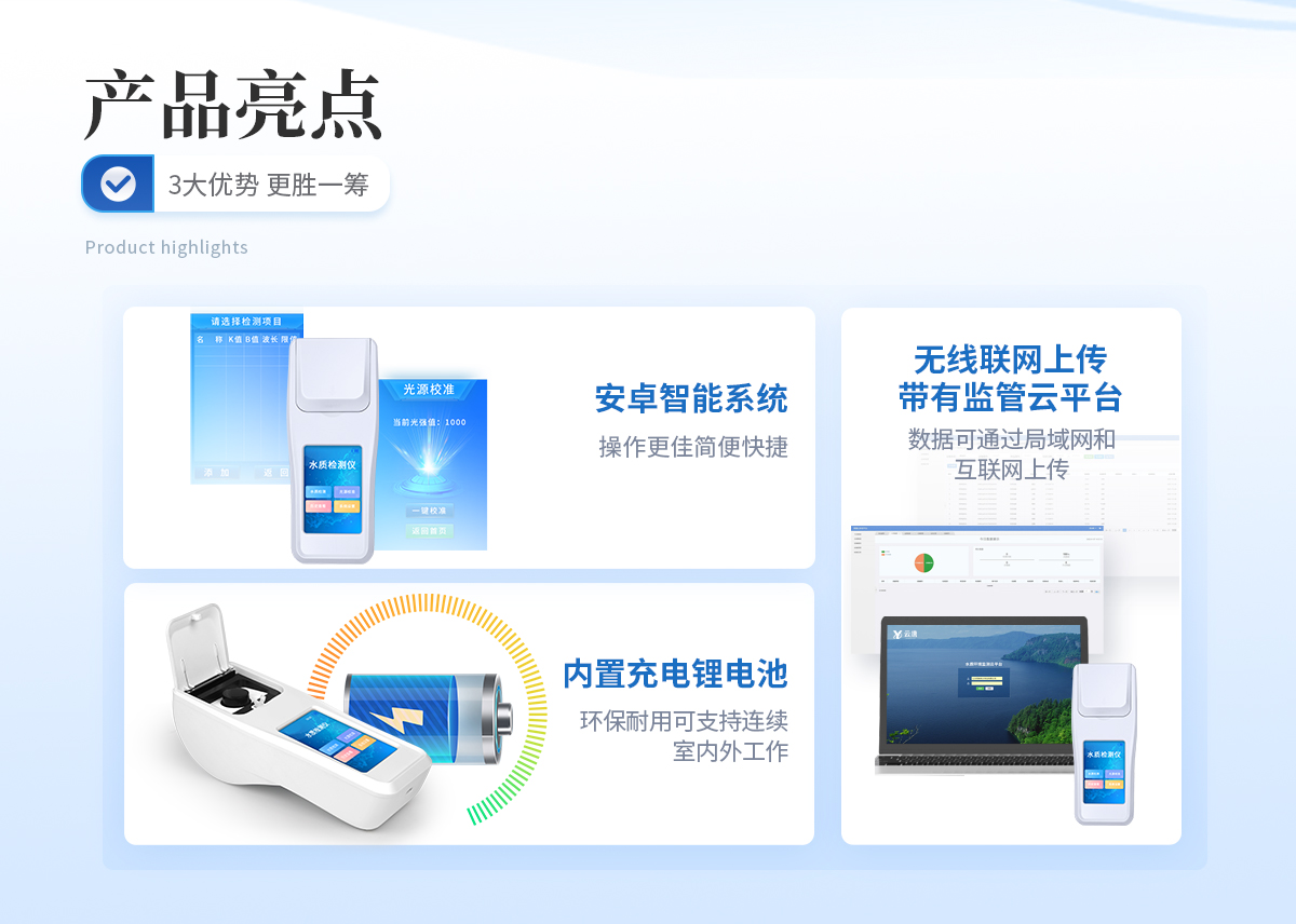 | ①安卓智能系统,操作更佳简便快捷; | ②配置云监控平台,检测结果可直接无线传至平台,进行水质长短期分析,辅助管理。 | ③内置操作流程、操作简单、无需培训、直接上手; | ④检测速度更快,现场读取数据; | ⑥便携式体积小,重量轻,方便户外检测; | ⑦外形小巧美观,工作稳定免维护,具有较好的性价比; | ⑧采用进口冷光源,光学性能稳定,寿命长达10万小时; | ⑨交直流两用,内置充电锂电池,环保耐用可支持连续室内外工作。 |