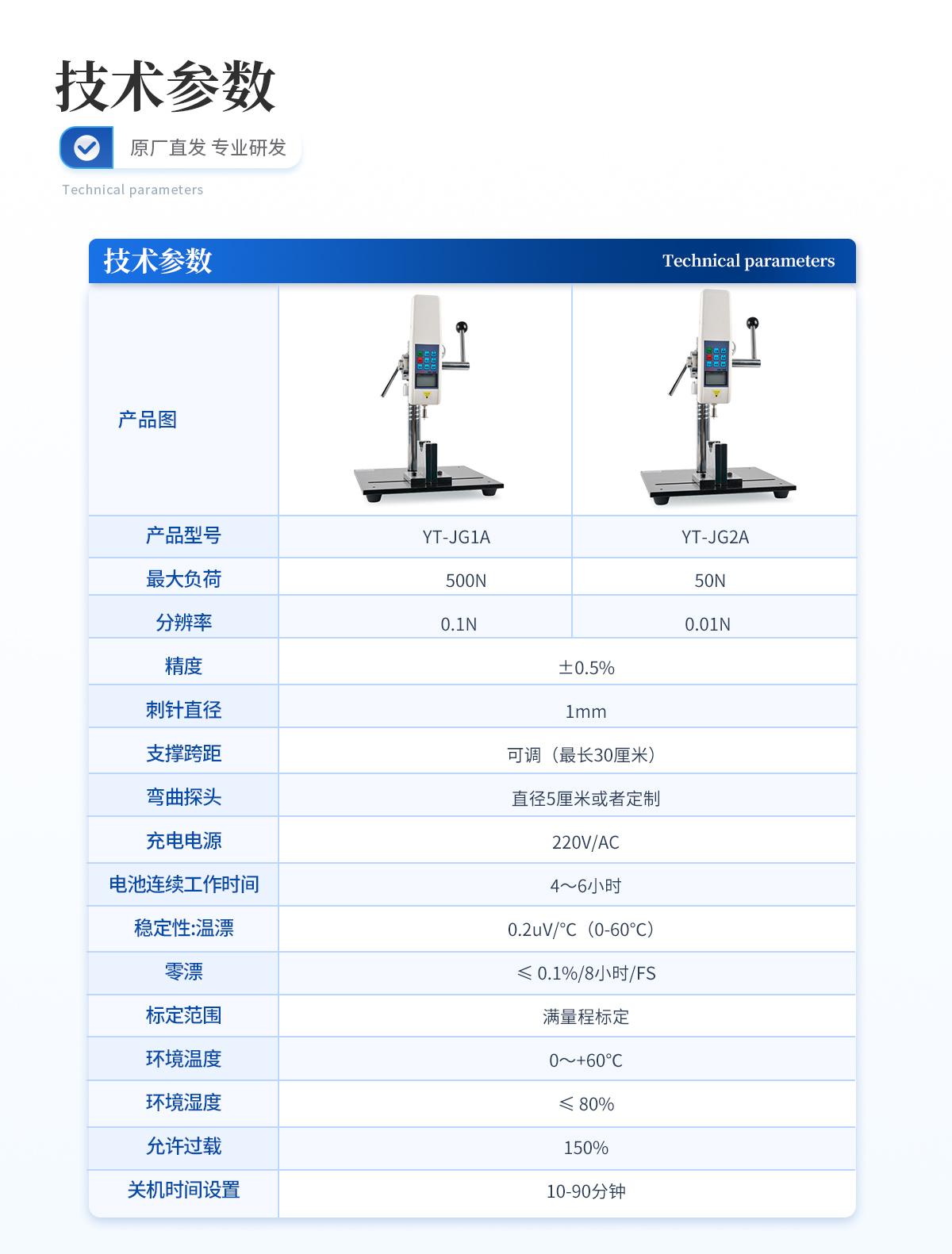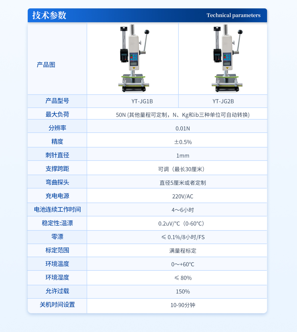 | 最大负荷:500N (其他量程可定制,N、Kg和ib三种单位可自动转换) | 分辨率:0.1N | 精度:±0.5%; | 刺针直径:1mm | 支撑跨距:可调(最长30厘米) | 弯曲探头:直径5厘米或者定制 | 充电电源:220V/AC; | 电池连续工作时间:4~6小时; | 稳定性:温漂:0.2uV/℃(0-60℃); | 零漂:≤ 0.1%/8小时/FS; | 标定范围:满量程标定; | 环境温度:0~+60℃; | 环境湿度:≤ 80%; | 允许过载:150%; | 关机时间设置:10-90分钟。 |