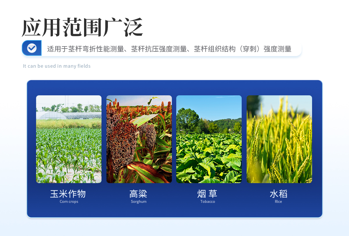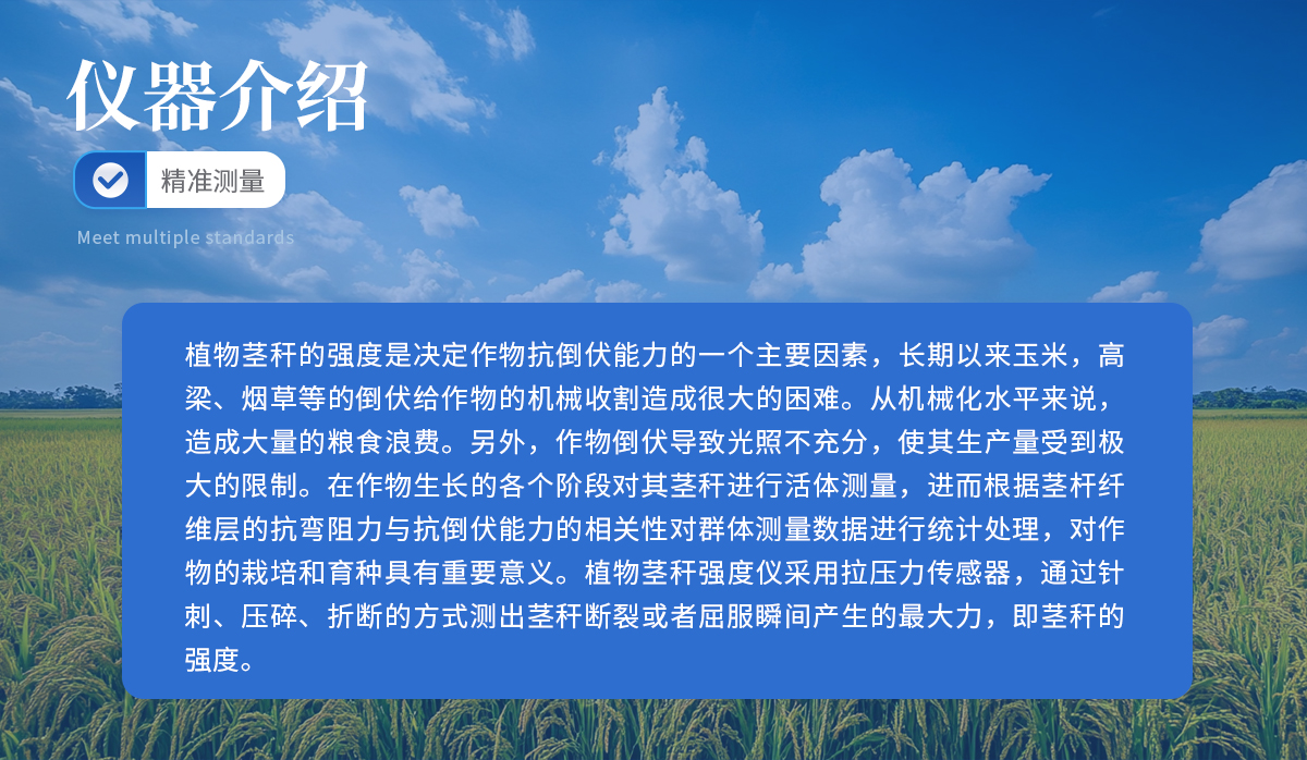 植物茎秆的强度是决定作物抗倒伏能力的一个主要因素,长期以来玉米,高梁、烟草等的倒伏给作物的机械收割造成很大的困难。从机械化水平来说,造成大量的粮食浪费。另外,作物倒伏导致光照不充分,使其生产量受到极大的限制。在作物生长的各个阶段对其茎秆进行活体测量,进而根据茎杆纤维层的抗弯阻力与抗倒伏能力的相关性对群体测量数据进行统计处理,对作物的栽培和育种具有重要意义。植物茎秆强度仪采用拉压力传感器,通过针刺、压碎、折断的方式测出茎秆断裂或者屈服瞬间产生的最大力,即茎秆的强度。
